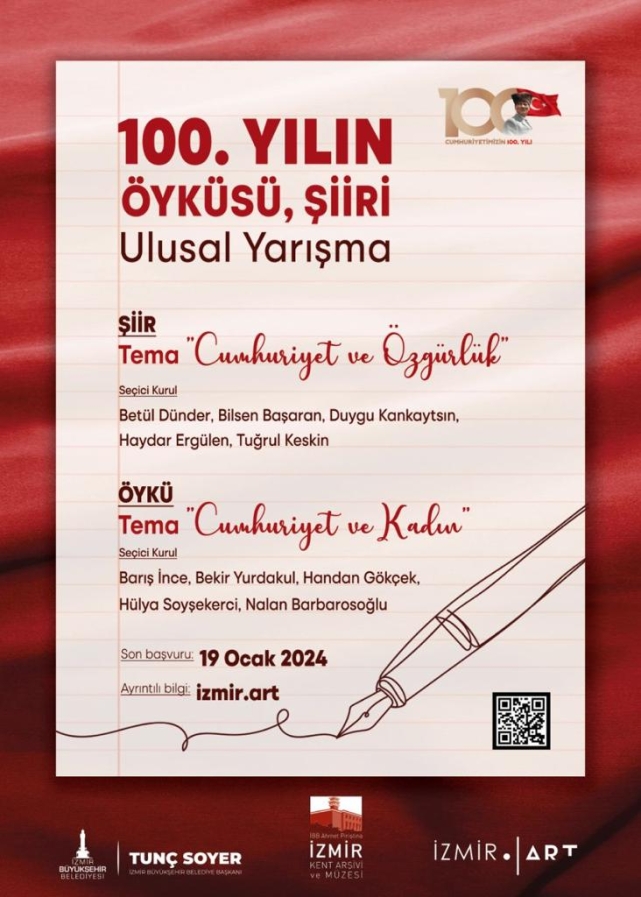 İzmir Büyükşehir Belediyesi’nin Cumhuriyet’in 100’üncü yıl dönümü kapsamında düzenlediği “100. Yılın Öyküsü, Şiiri” adlı ulusal öykü ve şiir yarışmasına başvurular başladı. Yarışma şiir kategorisinde “Cumhuriyet ve Özgürlük”, öykü kategorisinde ise “Cumhuriyet ve Kadın” temalarıyla düzenleniyor. Cumhuriyet’in kurucu kuşağının çağdaş ve aydınlık mirasını ana odağına alan ulusal katılımlı yarışma, yüz yıllık tarihi birikimin toplumsal ve kültürel izdüşümüne mercek tutmayı hedefliyor.Şiir dalı seçici kurul üyeleri Betül Dünder, Bilsen Başaran, Duygu Kankaytsın, Haydar Ergülen ve Tuğrul Keskin’den oluşuyor. Öykü dalında ise seçici kurulda Barış İnce, Bekir Yurdakul, Handan Gökçek, Hülya Soyşekerci ve Nalan Barbarosoğlu yer alıyor.Her iki kategoride de yarışmanın birincilik ödülü 20.000 TL, ikincilik ödülü 15.000 TL, üçüncülük ödülü 10.000 TL olarak açıklandı. Mansiyon ödülüne hak kazanan 3’er yarışmacıya ise 10 ciltten oluşan "Geçmişten Günümüze Kurtuluşun 100. Yılında İzmir Kitap Dizisi” armağan edilecek.Sonuçlar 26 Şubat’ta açıklanacakÖdüle hak kazanan ve seçici kurulun belirlediği eserler Cumhuriyet’in 100’üncü yılı anısına özel olarak hazırlanacak kitapta toplanacak.İzmir Büyükşehir Belediyesi Kent Arşivi, Müzeler ve Kütüphaneler Şube Müdürlüğü tarafından düzenlenen yarışmanın son başvuru tarihi, 19 Ocak 2024 olarak belirlendi. Sonuçların 26 Şubat 2024 tarihinde ilan edileceği yarışmanın ödül töreni ise 8 Mart Dünya Kadınlar Günü etkinlikleri kapsamında düzenlenecek.18 yaş ve üzeri tüm yurttaşların katılımına açık yarışmaya ilişkin detaylı bilgiye ve yarışma katılım formuna, İzmir’in kültür sanat platformu https://www.izmir.art/ sayfası üzerinden ulaşabilecek.