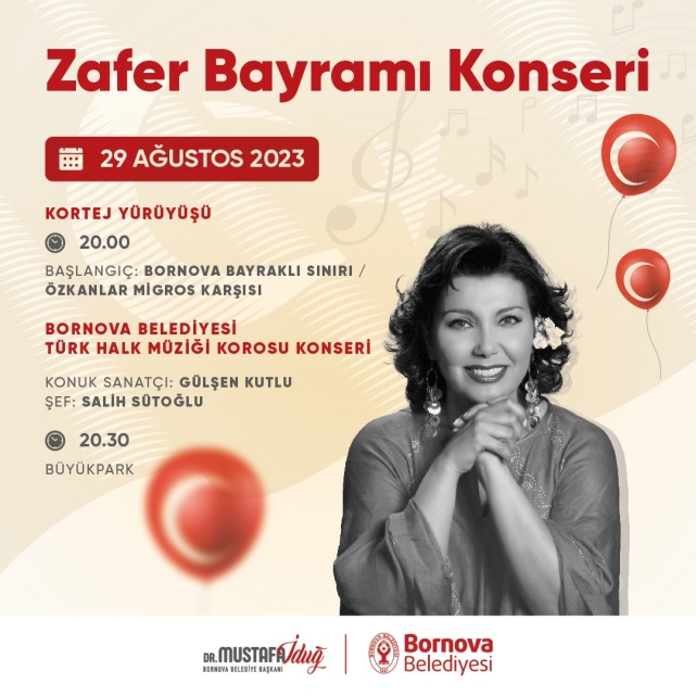 Geçişin ardından Bornova’nın tarihi alanlarından olan Büyükpark’ta Türk Halk Müziği şöleni yaşanacak. Saat 20:30'da Bornova Belediyesi Türk Halk Müziği Korosu Şef Salih Sütoğlu yönetiminde sahneye çıkarken, Gülşen Kutlu’da konuk sanatçı olarak müzikseverlerle buluşacak. Resmi törenler ise 30 Ağustos Çarşamba günü yapılacak.