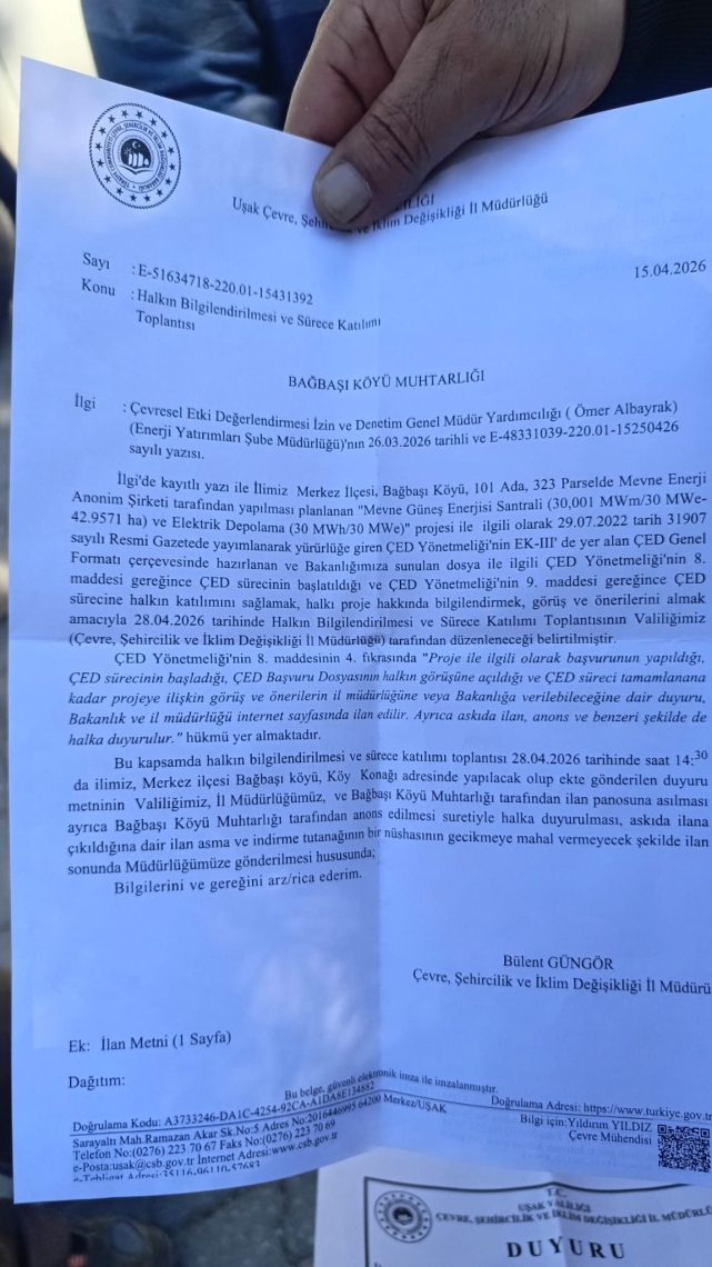 ÖMER FARUK ALTIN/EGE’YE BAKIŞ – Türkiye’nin dört bir yanında enerji ve maden projeleri kapsamında yürütülen, tartışmalar ve tepkilerle gündeme gelen Çevresel Etki Değerlendirmesi (ÇED) süreçlerinden biri de Uşak’ta 2022 yılından bu yana devam ediyor.Bölgede Güneş Enerji Santrali kurmayı amaçlayan Potens Enerji Limited Şirketi, Taykar Enerji Anonim Şirketi ve Mevne Enerji Anonim Şirketi’nin projelerine karşı bölge halkının mücadelesi sürüyor.Uşak’ın Merkez ilçesine bağlı Bağbaşı Köyü’nde, Mevne Enerji Anonim Şirketi tarafından yapılması planlanan “Mevne Güneş Enerji Santrali” projesine ilişkin bilgilendirme amacıyla Valilik tarafından bugün gerçekleştirilmesi planlanan “Halkın Bilgilendirilmesi ve Sürece Katılımı Toplantısı”, bölge halkının tepkisi üzerine gerçekleştirilemedi.