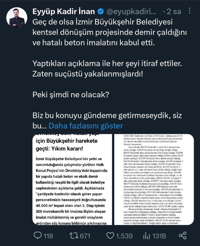 AK Parti İzmir Milletvekili Eyyüp Kadir İnan, İzmir Büyükşehir Belediyesi'nin kentsel dönüşüm projesinde demir çaldığını ve hatalı beton imalatını kabul ettiğini söyleyerek, "Bu rezalete kim sebep oldu? Tunç Soyer mi?" dedi. İzmir Büyüşehir Belediyesi'nin kentsel dönüşüm projesinde yaşanan süreci değerlendiren AK Parti'li Eyyüp Kadir İnan, tüm mühendis ve mimar odalarını gerekli incelemeleri yapmak üzere göreve davet etti. İnan, kentsel dönüşüm projesi sonrası yıkım kararı alındığını da hatırlatarak şöyle dedi:"Geç de olsa İzmir Büyükşehir Belediyesi kentsel dönüşüm projesinde demir çaldığını ve hatalı beton imalatını kabul etti. Yaptıkları açıklama ile her şeyi itiraf ettiler. Zaten suçüstü yakalanmışlardı! Peki şimdi ne olacak? Biz bu konuyu gündeme getirmeseydik, siz bu usulsüzlüğe müdahale edecek miydiniz? Biz hemşehrilerimizin can ve mal güvenliğini gözetmeseydik siz bu açıklamayı yapacak mıydınız? Aldığınız yıkım kararı neyi çözecek? Size güvenen insanları mağduriyetleriyle baş başa bıraktınız! Diğer konut projelerine dahil olan İzmirlileri tedirgin etmeye hakkınız var mı? İzmirlilerin canını bu kadar ucuz gören bir anlayış nasıl hesap verecek?Bu rezalete kim sebep oldu? Tunç Soyer mi? Bu beceriksizliğiniz diğer projelerde ve bloklarda da yaşandıysa bizi neler bekliyor olacak? 3 farklı inşaat mühendisine raporu sunduğumda, "Bırakın oturmayı, binaya girmem bile" dediler.Biz bir daha aynı acıları yaşamak istemiyoruz! Deprem gerçeğiyle hepimiz yaşıyorken beceriksizliğinizi “iletişim hatası” diyerek telafi edemezsiniz. Tüm mühendis ve mimar odalarını gerekli incelemeleri yapmak üzere göreve davet ediyorum! Gerçekler ortaya çıksın."