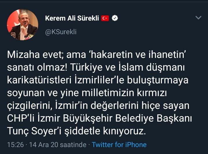 “Mizaha evet; ama ‘hakaretin ve ihanetin’ sanatı olmaz! Türkiye ve İslam düşmanı karikatüristleri İzmirliler’le buluşturmaya soyunan ve yine milletimizin kırmızı çizgilerini, İzmir’in değerlerini hiçe sayan CHP’li İzmir Büyükşehir Belediye Başkanı Tunç Soyer’i şiddetle kınıyoruz.”