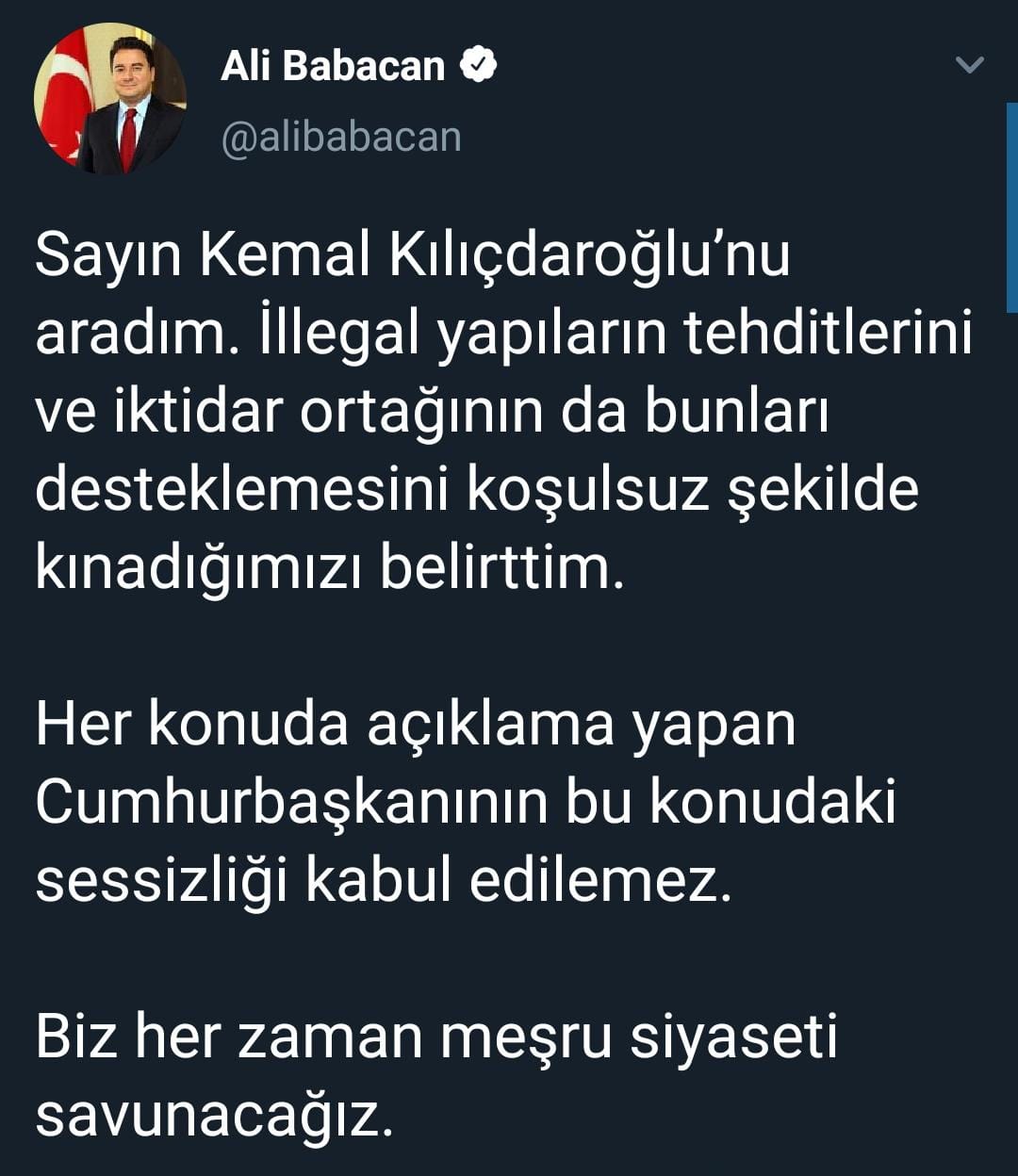 Twitter hesabından paylaşım yapan Babacan, CHP lideri Kemal Kılıçdaroğlu'nu aradığını ifade etti.Babacan'ın paylaşımı şöyle:"Sayın Kemal Kılıçdaroğlu’nu aradım. İllegal yapıların tehditlerini ve iktidar ortağının da bunları desteklemesini koşulsuz şekilde kınadığımızı belirttim. Her konuda açıklama yapan Cumhurbaşkanının bu konudaki sessizliği kabul edilemez. Biz her zaman meşru siyaseti savunacağız."