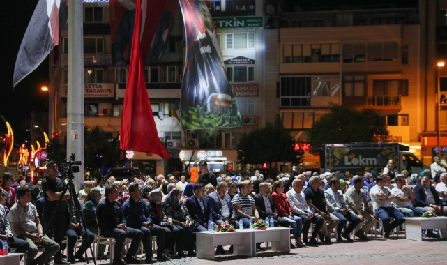 Demokrasi Meydanı’ndaki Anma programına Aliağa Kaymakamı Ömer Karaman, Aliağa Belediye Başkanı Serkan Acar, Garnizon Komutanı Albay Faruk Altun, Aliağa Cumhuriyet Başsavcısı Mehmet İmir, şehit aileleri, İlçe Jandarma Komutanı Yüzbaşı Yusuf Can Gökgöz, İlçe Emniyet Müdürü Mehmet Balıkçıoğlu, Aliağa İlçe Milli Eğitim Müdürü Dr. Erdoğan Akyüz, daire amirleri, STK temsilcileri, siyasi parti yöneticileri ile vatandaşlar katıldı. Saygı duruşunda bulunulması ve İstiklal Marşı’nın okunmasıyla başlayan anma programı ilçe müftülüğü tarafından görevlendirilen müezzinlerin Kur’an-ı Kerim Tilavetiyle devam etti.