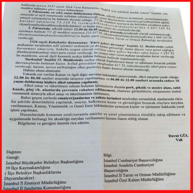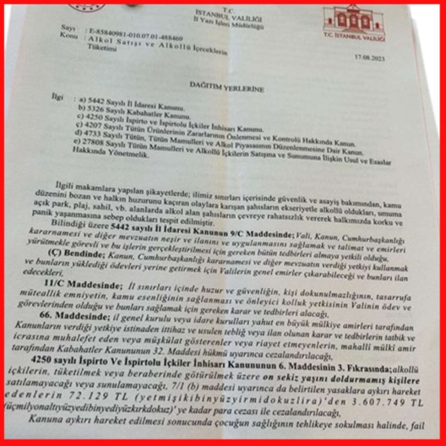 Cumhuriyet, Valilik tarafından ilgili kurumlara gönderilen o yasak metnine ulaştı. Metinde yert alan ifadeler ise oldukça çarpıcı. Valilik tarafından gönderilen yazıda kentte asayiş sorunlarının genellikle alkolden kaynaklandığı iddia edildi.