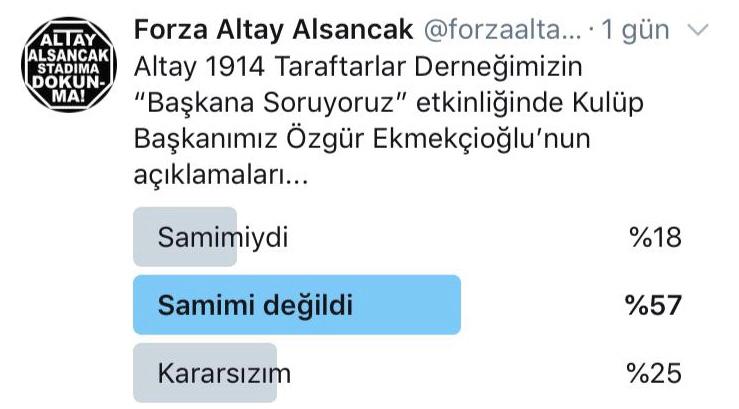 Yaşanan gelişmeler üzerine Altay Spor Kulübü Başkanı Özgür Ekmekçioğlu, pazartesi akşamı Altay 1914 Taraftarlar Derneği’nin sosyal medya hesabında ki canlı yayında taraftarların merak ettiği soruları yanıtladı. Başkan Ekmekçioğlu’na Altay Alsancak Stadı, kulübün mali tablosu, yapılan transferler ve teknik direktör seçimine dair birçok soru yöneltildi.