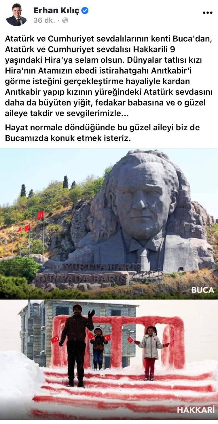 Hira ve babasına bir davet de Buca Belediye Başkanı Erhan Kılıç’tan geldi. Başkan Kılıç, sosyal medya hesapları üzerinden Buca Belediyesi’ne ait Atatürk Maskı ve Hira’nın fotoğrafını paylaşarak, “Atatürk ve Cumhuriyet sevdalılarının kenti Buca'dan, Atatürk ve Cumhuriyet sevdalısı Hakkarili 9 yaşındaki Hira'ya selam olsun. Dünyalar tatlısı kızı Hira'nın Atamızın ebedi istirahatgâhı Anıtkabir'i görme isteğini gerçekleştirme hayaliyle kardan Anıtkabir yapıp kızının yüreğindeki Atatürk sevdasını daha da büyüten yiğit, fedakar babasına ve o güzel aileye takdir ve sevgilerimizle...Hayat normale döndüğünde bu güzel aileyi biz de Bucamızda konuk etmek isteriz” ifadelerine yer verdi.