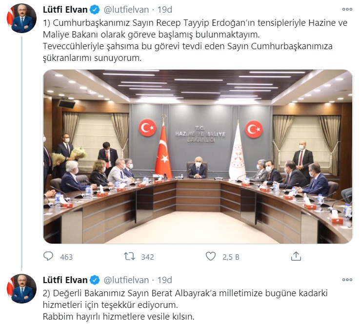 "Cumhurbaşkanımız Sayın Recep Tayyip Erdoğan’ın tensipleriyle Hazine ve Maliye Bakanı olarak göreve başlamış bulunmaktayım. Teveccühleriyle şahsıma bu görevi tevdi eden Sayın Cumhurbaşkanımıza şükranlarımı sunuyorum.