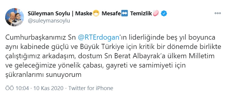 "Cumhurbaşkanımız Sn @RTErdogan'ın liderliğinde beş yıl boyunca aynı kabinede güçlü ve Büyük Türkiye için kritik bir dönemde birlikte çalıştığımız arkadaşım, dostum Sn Berat Albayrak’a ülkem Milletim ve geleceğimize yönelik çabası, gayreti ve samimiyeti için şükranlarımı sunuyorum."