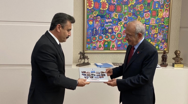 CHP Genel Başkanı Kemal Kılıçdaroğlu'nu parti genel merkezinde ziyaret eden dikili Belediye Başkanı Adil Kırgöz, 550 günde Dikili'de yapılan çalışmaların yer aldığı faaliyet raporunu Kılıçdaroğlu'na sundu.