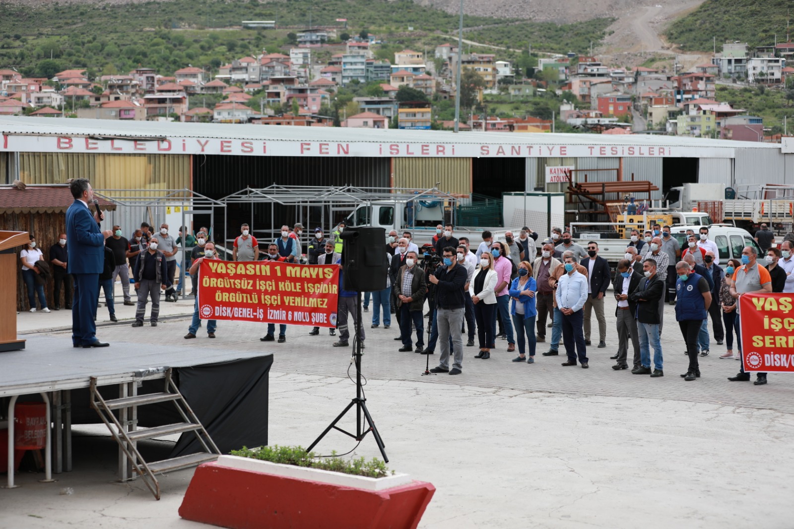 Pandemi tedbirleri kapsamında alınan tam kapanma uygulaması nedeniyle erken düzenlenen 1 mayıs Emek ve Dayanışma Günü etkinliğine Başkan Sandal’ın yanı sıra CHP Bayraklı İlçe Başkanı Pınar Susmuş, CHP ilçe örgütü yöneticileri, belediye bürokratları ve işçiler katıldı.