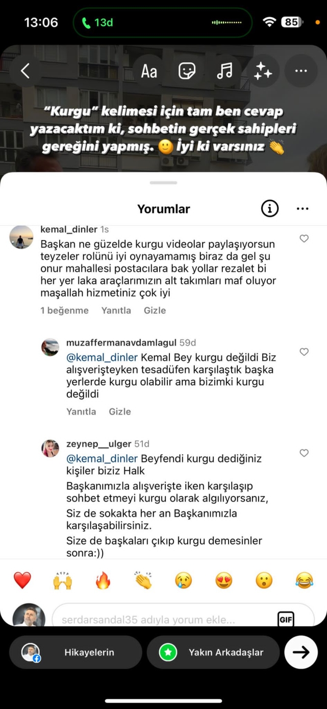 Mahalle gezilerini aralıksız sürdüren Bayraklı Belediye Başkanı Serdar Sandal’ın alışverişten dönen kadınlarla ayaküstü yaptığı sohbete, sosyal medya hesabından bir vatandaş “Kurgu” yanıtını verdi.“Kurgu” eleştirisine cevap, yine sohbette bulunan kadınlardan geldi: “Biz halkız ve her an sokakta başkanımızla karşılaşıp sohbet edebiliyoruz. Siz de başkanımızla karşılaşabilirsiniz.”Başkan Sandal, takipçileri arasındaki bu tatlı atışmayı “'Kurgu' kelimesi için tam ben cevap yazacaktım ki, sohbetin gerçek sahipleri gereğini yapmış. İyi ki varsınız” notuyla paylaştı.