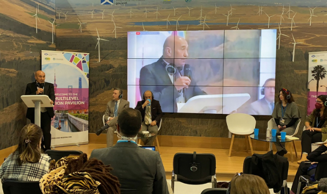 İzmir Büyükşehir Belediye Başkanı Tunç Soyer, 31 Ekim-12 Kasım 2021 tarihlerinde Glasgow'da düzenlenen 26. BM İklim Değişikliği Taraflar Konferansı'na (COP26) İzmir’i ve dünya kentlerini temsilen dört oturumda konuşma yapmak üzere katıldı. İklim Mirası Ağı, Dünya Belediyeler Birliği (UCLG), Sürdürülebilir Kentler Ağı (ICLEI) tarafından düzenlenen “Kültürün Öncülüğünde İklim Dirençli Gelecek: Nesiller Arası Diyalog (Culture Driving Climate Resilient Futures: An Intergenerational Dialogue)” başlıklı oturumda konuşan Başkan Tunç Soyer, “İklim krizi tüm dünyayı büyük bir felakete sürüklerken İzmir’i temsilen geldiğim COP26’da, dünyanın her yerinden gelen meslektaşlarımla doğaya uyumlu yeni şehirler kurmak için çalışıyoruz. İzmir’i doğayla uyumlu yaşamın öncü şehri yapmak en temel hedefimiz” dedi.