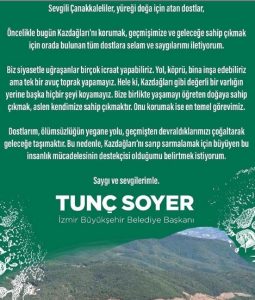 Yaptığı paylaşımı bir başlıkla açıklayan Soyer, Biz siyasetle uğraşanlar birçok icraat yapabiliriz. Yol, köprü, bina inşa edebiliriz ama tek bir avuç toprak yapamayız. Hele ki Kazdağları gibi değerli bir varlığın yerine başka hiçbir şeyi koyamayız. #KazdağlarıHepimizin yazarak açıklamasını paylaştı.