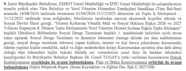 ÖMER FARUK ALTIN/EGE’YE BAKIŞ - İzmir Büyükşehir Belediyesi Ocak Ayı Meclis Toplantısı Üçüncü Birleşimi Meclis Başkanvekili Zafer Levent Yıldır yönetiminde gerçekleşti.Ocak ayının ilk meclis toplantısında, İzmir Büyükşehir Belediyesi ile Tüm Bel-Sen arasında imzalanan Toplu İş Sözleşmesi (TİS) kapsamında; ekonomik koşullar göz önüne alınarak memurlara ödenen Sosyal Denge Tazminatı'nın yasal tavan tutarı aşabilmesi için Başkan Cemil Tugay’a yetki verilmesi gündeme gelmişti. Ancak ilgili maddeye göre; tavan tutarın aşılması nedeniyle ileride hukuki bir sorun çıkması durumunda, yapılan fazla ödemelerin çalışanlardan yasal faiziyle geri alınması şartı getirildi.Hukuk Komisyonu'ndan oyçokluğu, Plan ve Bütçe Komisyonu'nda oybirliği ile meclis gündemine gelen önerge meclisten oyçokluğu ile kabul edildi.İlgili önerge şu şekilde: