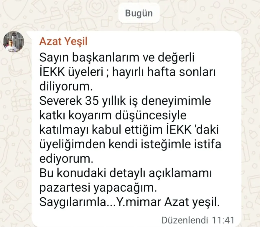 TOKİ’nin Mavişehir’de satışa çıkardığı belediye hizmet alanını 184 milyon TL’ye satın alan İZKA İnşaat’ın Yönetim Kurulu Başkanı Azat Yeşil ile İzmir Büyükşehir Belediye Başkanı Cemil Tugay arasındaki gerginlik, istifa getirdi.Tek Referans'tan Sinan Doğan'ın haberine göre, Azat Yeşil, Büyükşehir Belediye Başkanı Cemil Tugay’ın koordinasyonunu yaptığı İzmir Ekonomik Kalkınma Koordinasyon Kurulu’ndan istifa etti. Yeşil, istifasını bugün İEKKK Grubu’na “Sayın Başkanlarım ve değerli İEKKK üyeleri, hayırlı hafta sonları diliyorum. Severek 35 yıllık iş deneyimlerimle katkı koyarım düşüncesiyle katılmayı kabul ettiğim İEKKK’daki üyeliğimden kendi isteğimle istifa ediyorum. Bu konudaki detaylı açıklamamı pazartesi yapacağım” dedi.