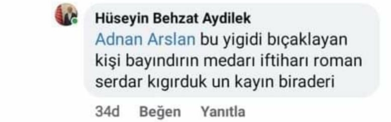 Sosyal medyadan yaptığı yoruma Roman vatandaslardan gelen tepkiler uzerine yine sosyal medya üzerinden cevap veren Aydilek, "9 Ocak akşamı Turan köyünün yiğit evladı, oğlum gibi sevdiğim ERAY UMUTLU'yu bir cinayet sonucu yitirdik. O gece yaşadığım üzüntü ve yas ortamında bana çok sayıda kişi tarafından sorulan "katil kim?" Sorusuna verdiğim bir cevap amacımın ötesinde anlaşılmalara ve zorlama yorumlara yol açtı. Verdiğim bu cevabın ne Sayın Serdar Kıgırduk ile ne de sevgili roman dostlarımla bir bağlantısının olmadığının bilinmesini ve o yazının bu kapsamda değerlendirilmesini diliyor, üzüntülerimi ifade ediyorum" şeklinde açıklamalarda bulundu.