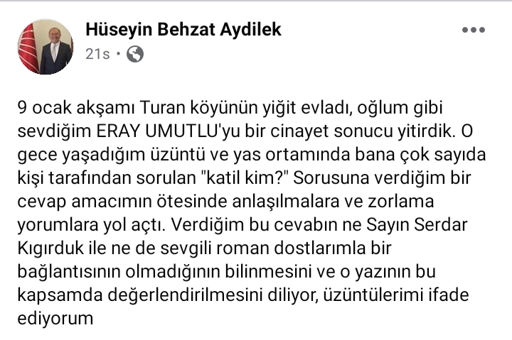 EGE'YE BAKIŞ/ İzmir'in Bayındır ilçesine bağlı Turan köyünde 9 Ocak günü acı bir olay yaşandı. Iki kişi arasında çıkan tartışmada Eray Umutlu isimli gencin cinayete kurban gitmesiyle katil kim? Sorusu gündeme geldi. Bir sosyal paylaşım sitesinde CHP bayındır ilçe başkanı Hüseyin Behzat Aydilek'in Romanları ve Bayındır roman Derneği Başkanı Serdar Kıkırdak'ı hedef gösterdiği ddiasıyla ilçe karıştı. Romanlardan gelen 'ikinci Erman Toroğlu vakası' şeklindeki tepkiler üzerine paylaşımını silen Aydilek, ardından özür dilediği bir paylaşım yaptı.
