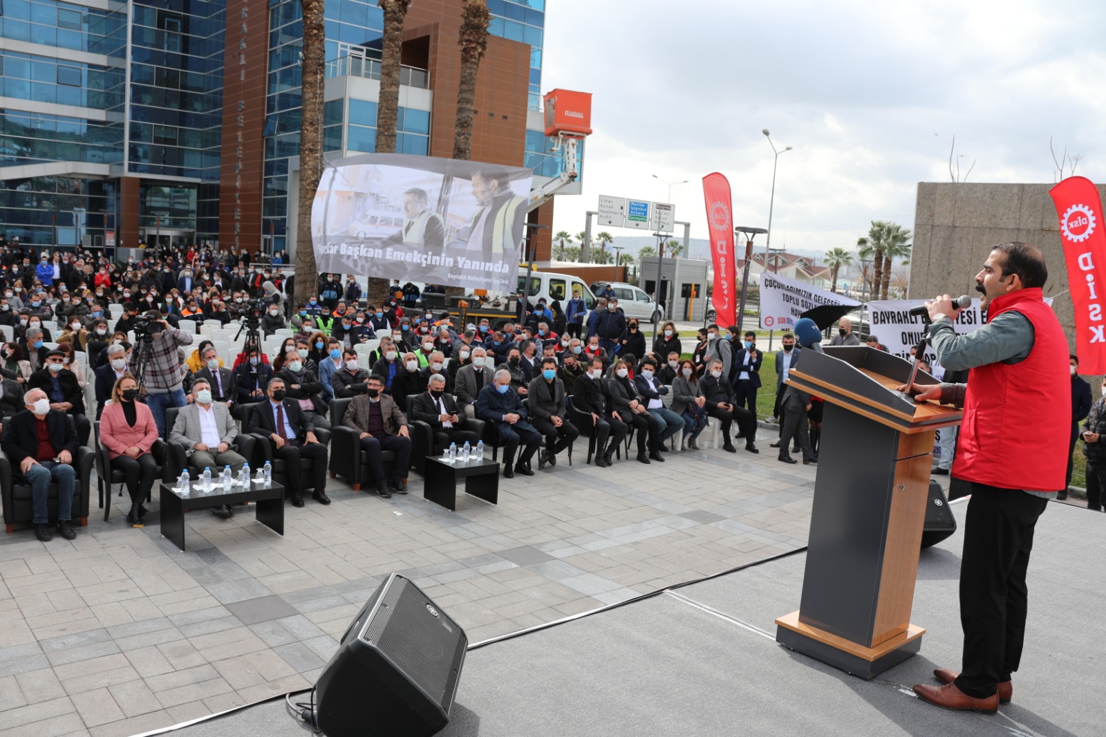 DiSK Genel İş Genel Başkanı Remzi Çalışkan da, “Acıyı da mutluluğu da her beraber yaşamak, böyle bir şey, depremi en fazla hisseden Bayraklı halkına geçmiş olsun. Birçok zorluğun üzerine bir de pandemi ve deprem geldi. Ekonomik olarak etkileniyoruz. İnsanca yaşam talebimiz var. Burada mutlulukla izliyorum, emek dostu olmak böyle bir şey. Bu güzel günün bir parçası olmak çok güzel. Ülkede umutsuzluk ve tükenmişlik havası var ancak biz bunu hiçbir zaman kabul etmeyeceğiz. Demokrasi işçinin ekmeğidir. Durum ortadayken, şartlarını zorlayarak, toplu iş sözleşmesinde böyle artış getiren Bayraklı Belediye Başkanı serdar sandal başkanımıza teşekkür ediyorum. Asgari ücret açıklandı, tabi ki açıklanan miktarı asla kabul etmiyoruz. Bayraklı’da adeta en düşük asgari ücret 5 bin 200 olarak belirleyen belediye başkanını alkışlıyorum. Sözleşmenin hayırlı, uğurlu olmasını diliyorum” dedi. TÜRKİYE'DEKİ EN İYİ SÖZLEŞMELERDEN BİRİ