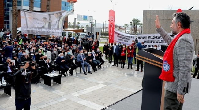 Belediye çalışanlarının yoğun alkışları ve sloganlar eşliğinde DİSK atkısıyla konuşma yapan Bayraklı Belediye Başkanı Serdar Sandal, "Biz bir mucize yaratmıyoruz, yaptığımız tek iş ortak akıl çevresinde masaya oturuyoruz. Bunun dışında zihnimizin arkasında başka bir şey yok. Büyükşehirle kamuyla, muhtarlarla, küsmüş bir yönetim yerine tamamını içine alan bir belediye arzuladık. Bunu da başardık. Büyükşehir Belediyesi, Bayraklı’ya 140 milyon TL yatırım yaptı. Buradan İzmir Büyükşehir Belediye Başkanımıza şükranlarımı sunuyorum. Bir kentin sorunlarını doğru tespit etmek için önce kadrolarınız olacak. Biz göreve geldiğimizde bunun için çalıştık. Bizim başkan yardımcısı, müdür değişikliklerimizin altında yatan tek neden de budur. Yaptıklarımız, yapacaklarımızın teminatı olarak algılansın istiyoruz.