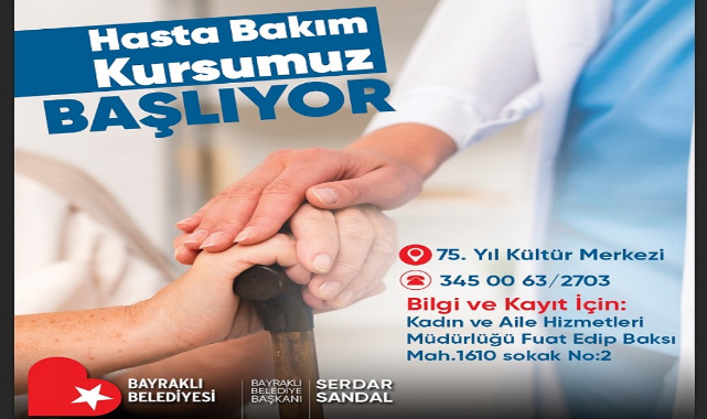 Hasta bakımı konusunda nitelikli eleman yetiştirmeyi ve istihdama katkı sağlamayı amaçlayan Bayraklı Belediyesi, Halk Eğitim Müdürlüğü iş birliğiyle ‘Hasta Bakım Kursu’ açacak. Hafta sonları düzenlenecek kurslara katılanlar sertifika sahibi olacak. Katılımcılara, teorik ve uygulamalı olarak hasta bakımının detayları anlatılacak.