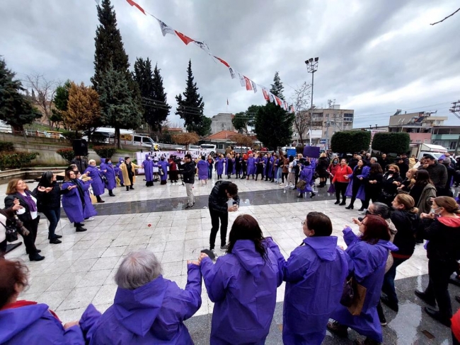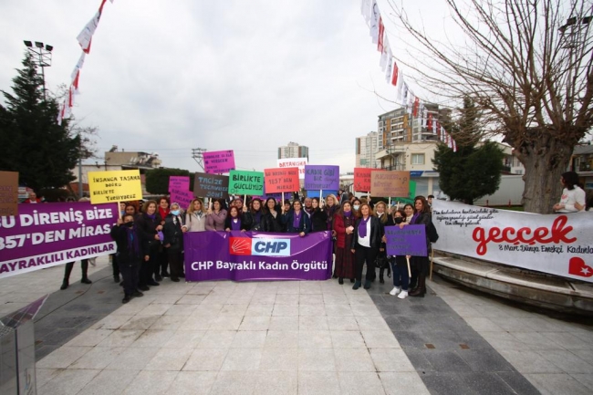 Dünya Emekçi Kadınlar Günü’nde Bayraklı’nın güçlü kadınları tek yürek oldu. Kültür ve Sosyal İşler Müdürlüğü tarafından Yamanlar Mahallesi Nazım Hikmet Parkı’nda düzenlenen etkinlikte kadın cinayetlerine vurgu yapıldı. Son 3 ayda katledilen kadınlar anısına 72 kadının isminin yazılı olduğu panoya kadın ayakkabıları çakılarak farkındalık yaratıldı. Gitarist Haydar Yağmur, müzik dinletisi sundu. Kadınlar, “Dayanışma yaşatır, Boşanmayı Değil Cinayeti Engelle, Yaşasın Kadın Dayanışması” yazılı yaşam, kadın ve özgürlük temalı pankartlar açtı. Olumsuz hava koşullarına rağmen çok sayıda kadının katıldığı etkinlikte hep bir ağızdan özgürlük ve barış sloganları atıldı.