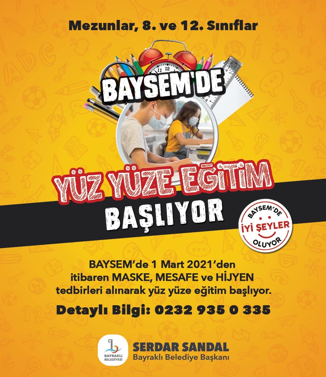 ONLİNE EĞİTİME GEÇEN İLK KURUM BAYRAKLI BELEDİYESİ OLMUŞTUDünyayı etkisi altına alan virüs riski nedeniyle yüz yüze eğitime geçici süreyle ara veren BAYSEM, eğitim gören 940 öğrenciye yönelik uzaktan eğitim dönemini başlatan ilk belediye olmuştu. Evinde internet bulunan her baysem öğrencisi, kurulan sistem sayesinde derslerini takip etti. Proje, Milli Eğitim Bakanlığı’nın belirlediği süre boyunca devam etti. TV BEK İLE TELEVİZYONDAN EĞİTİM DÖNEMİ BAŞLAMIŞTIÖte yandan pandemi sürecinde Bayraklı'da gönüllü öğretmenler bir araya gelerek hem YKS hem de LGS’ye hazırlanan öğrenciler için bayraklı belediyesi öncülüğünde kurulan Bayraklı Eğitim Kanalı (TV BEK) projesini hayata geçirmişti. Bu kapsamda TV BEK hafta içi her gün saat 09.00 ile 11.00 saatleri arasında TV 35 kanalı üzerinden eğitim vermeye başlamıştı. Halen devam eden yayınlarda Baysem eğitmenleri tarafından kaydedilen programlar, Türkiye’nin dört bir yanındaki interneti, bilgisayarı olmayan dezavantajlı çocuklara ücretsiz eğitim hizmeti sunuyor. TÜM ÖĞRENCİLERİMİZE BAŞARILAREğitimci bir belediye başkanı olarak her fırsatta eğitime ve öğrencilere yapılacak destekler konusunda üzerine düşenin fazlasını yapan Bayraklı Belediye Başkanı Serdar Sandal, "Pandemi dolayısıyla ülke genelinde ara verilen yüz yüze eğitimlerin tedbirli ve kademeli olarak yeniden başlayacak olması sevindirici. Pandemi sürecinde online eğitime geçen ilk kurumlardan biri BAYSEM olmuştu ve eğitimlerimizi aksatmadan internet üzerinden vermeye başlamıştık. Ayrıca televizyon kanalı aracılığıyla da evlerinde bilgisayar ve interneti olmayan çocuklarımız için TV BEK projemizi hayata geçirmiştik. Eğitim alanında öğrencilerimiz için tüm imkanlarımızı seferber ediyoruz. Bu konuda Bayraklı Belediyesi olarak gerekli hazırlıklarımızı tamamladık ve aldığımız tedbirlerle yüz yüze eğitimlere yeniden başlayacağız. Şimdiden tüm öğrencilerimize başarılar diliyorum" dedi.