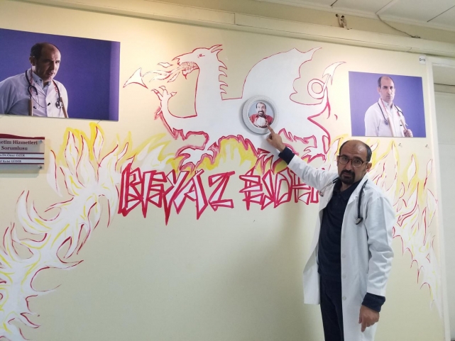 Jülide Şehitoğlu -Animasyonun önünde poz veren Dr. Gaffar Karadoğan, “Sağlıkta piyasalaşmanın getirdiği hizmete ulaşmadaki zorluk, halkın önüne biz sağlık çalışanlarını yem olarak sunmuştur. Sağlıkta şiddetin nedenlerini ortadan kaldırmak için adım atılmazsa, sağlıkçılar olarak kendi savunma sistemimizi geliştirmek, belki de uzak doğu sporları öğrenmek zorunda kalacağız. Bütün sağlık çalışanları birer beyaz ejder olmak zorunda mı?” diye soruyor:“2005 yılında hasta yakınları tarafından öldürülen Dr. Göksel Kalaycı' dan 2022 öldürülen Dr. Ekrem Karakaya' ya kadar son onyedi yılda dokuz meslektaşımız yaşamını yitirdi. Sağlıkta artan şiddet olaylarının sebeplerinin en fazla etkilenen ve farkında olanlar yine biziz, çözüm önerilerinin de bize sorulmasını önemsiyoruz, değerli buluyoruz. Şiddetin önlenmesi ve köklü çözümü için elbette polisiye önlemler gerekli. Ancak, asıl çözüm şiddetin sebeplerini ortadan kaldırmaktır” diyen Dr. Gaffar Karadoğan, çözüm önerilerini şöyle sıraladı:“Ülkenin sağlığa ayırdığı bütçe yüzde dört ve çok yetersiz. Kişilerin refah düzeyi de düşük olduğu için sağlık hizmetine ulaşmaya bütçesi yetmiyor. Refah seviyesinin yükselmesi, sağlığa ayrılan bütçenin arttırılması gerekir.