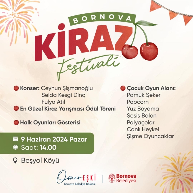 Bornova’nın eski köy yerleşimlerinden olan Beşyol Mahallesi’nde geçmişte düzenlenen ve büyük ilgi gören Kiraz festivali, yeniden tüm İzmirlilerle buluşacak. 9 Haziran Pazar günü saat 14.00’te başlayacak Festival’de “En Güzel Kiraz Yarışması”nın ödül töreni de yapılacak. Halk oyunları gösterisinin yanı sıra Ceyhun Şişmanoğlu, Selda Kesgi Dinç ve Fulya Atıl’ın sahne alacağı konser ziyaretçileri coşturacak. Festival’e özel olarak oluşturulan çocuk oyun alanında pamuk şeker ve patlamış mısır ikramı yapılacak. Yüz boyama ve sosis balon etkinliklerinin de yapılacağı alanda palyaço ve canlı heykel performansları sahnelenecek. Çocuk oyun alanına şişme oyuncaklar da kurulacak.