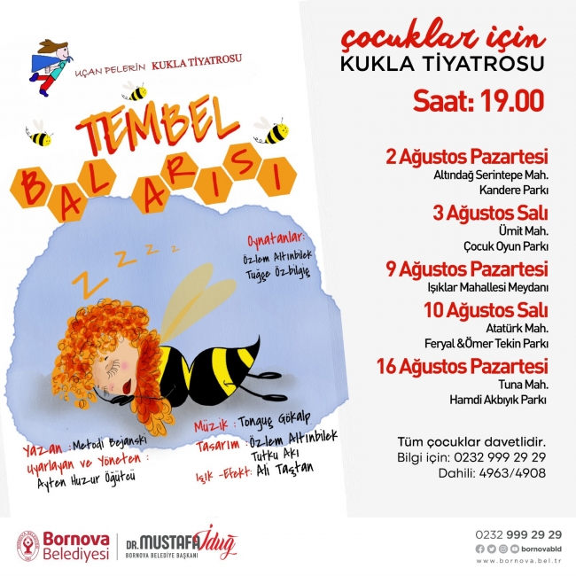 Pandemi sürecinde zor zamanlar geçiren ve evlerine kapanmak zorunda kalan çocuklar için hazırlanan organizasyon 2-16 Ağustos tarihleri arasında Pazartesi ve Salı günleri saat 19:00’da gerçekleşecek. Uçan Pelerin Kukla Tiyatrosu tarafından hazırlanan etkinlikte ‘Tembel Bal Arısı’ adlı gösteri Bornova'nın farklı mahallerine çocuklarla buluşacak.
