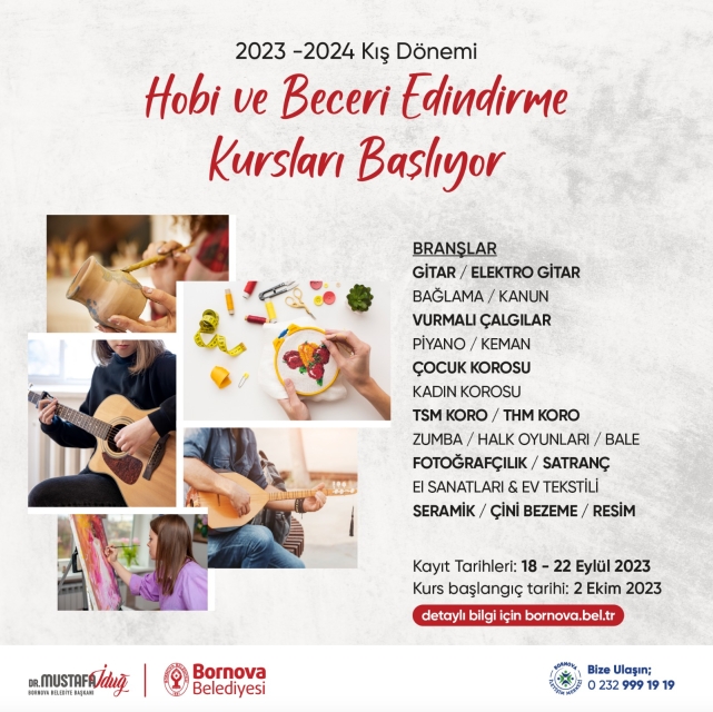 Her yaştan insana hitap eden kurslar, Bornovalılar için sosyalleşme alanı sağlayacak. Hobi ve Beceri Edindirme kursları gitar, elektro gitar, kanun, bağlama, vurmalı çalgılar, piyano, keman, çocuk korosu, kadın korosu, TSM Korosu, THM Korosu, zumba, halk oyunları, bale, fotoğrafçılık, satranç, el sanatları, ev tekstili, seramik, çini bezeme ve resim branşları olmak üzere toplam 21 dalda açılacak.