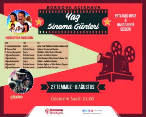 Bornova Açıkhava Yaz Sinema Günleri kapsamında ise 27 Temmuz-8 Ağustos tarihleri arasında 'Çiçero' ve 'Hedefim Sensin' filmleri 8 mahallede 8 ayrı günde gösterilecek. Bornova Belediyesi'nin patlamış mısır ve gazoz ikramlarıyla vatandaşlara nostalji yaşatacak gösterimler saat 21.00'de başlayacak.
