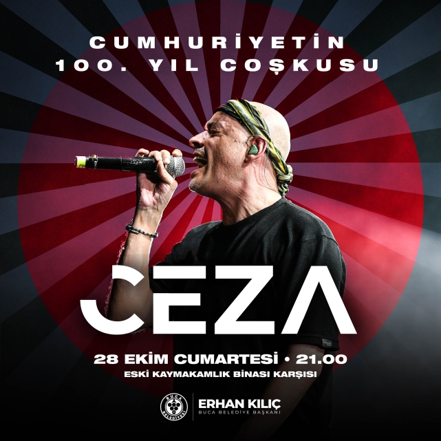 Saat 21.00’de konser alanında Türk rap müziğinin sevilen ismi Ceza sahne alacak. Ünlü sanatçı en sevilen parçalarını İzmirlilerle birlikte seslendirecek. 29 Ekim Pazar günü ise Buca Belediyesi Kültür Sanat Merkezi’nde saat 20.00’de Cumhuriyet Resepsiyonu düzenlenecek.