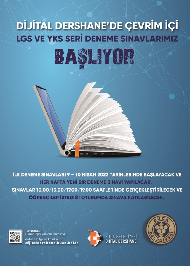 Dijital Dershane’de, LGS ve YKS sınavına girecek öğrenciler için çevrim içi seri deneme sınavları başlıyor. Öğrencileri her hafta yeni bir deneme sınavı beklerken, ilk sınav takvimi ise 9 – 10 Nisan olarak açıklandı. Sınavların 4 farklı oturum saatinde yapılacağı, öğrencilerin 10.00/13.00/17.00/19.00 saatlerinden istediğini seçip sınav kaydı oluşturabilecekleri ifade edildi. Toplamda 10 LGS, 10 YKS deneme sınavının yapılacağı çevrim içi deneme sınavlarına girmek isteyen öğrencilerin https://dijitaldershane.buca. bel.tr adresi üzerinden Dijital Dershane’ye kayıt yaptırmalarının yeterli olduğu belirtildi.