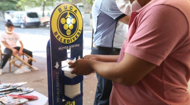 Buca pazarlarında el dezenfektanlı önlem