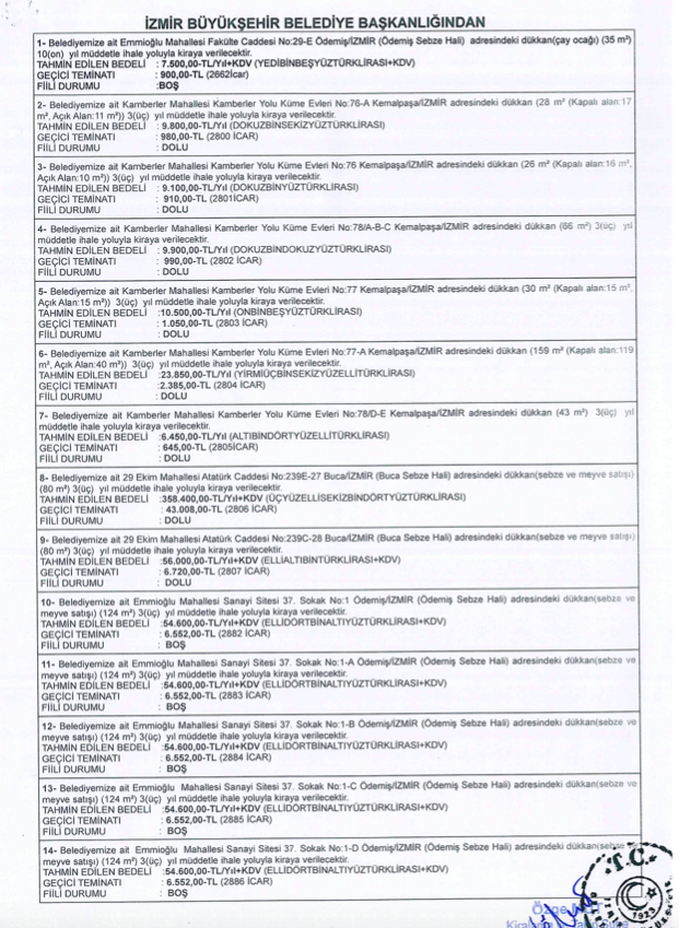 Güncel Yayınlanma: 23 Ekim 2023 - 12:12 Büyükşehir Belediyesi üç ilçedeki 18 taşınmazını kiraya veriyor İzmir Büyükşehir Belediyesi mülkiyeti kendinde olan çoğunluğu dükkan 18 taşınmazını açık artırma usulüne göre ihaleyleyle kiraya veriyor. Güncel 23 Ekim 2023 - 12:12 Yorumlar TAKİP ET Yazdır A Büyüt A Küçült Yorumlar İzmir Büyükşehir Belediyesi Kiralama ve Takip Şube Müdürlüğü; Ödemiş, Buca ve Kemalpaşa'da bulunan 11'i boş durumda olan 18 taşınmazını kiraya veriyor. İŞTE KİRALIK TAŞINMAZLAR VE ŞARTMANE: # İzmir Büyükşehir Belediyesi YORUMLAR adlı kullanıcıya cevap x Gönder İlginizi Çekebilir 'Buca Metrosu çalışmaları durdu' iddialarına belediyeden yanıt! Devlet Hastanesinde 'Normal doğum' ısrarı iddiası: Bebek hayatını kaybetti! Birlik Yerel Sen, belediye başkanlarına seslendi: Emeğimizi meze etmeyeceğiz! Atina’da silahlı saldırılar: 5 yaralı! Son Haberler 3 şirket bir mera! Köylüye gidecek yer kalmadı! 10 günde 75 ilde uyuşturucuya darbe: 3,3 milyon hap ele geçirildi! Karşıyaka’da üniversite adımı: Deniz Baykal Kültür Merkezi MYO’ya... Konak’ta Makedonya rüzgarı esti: Başkan Mutlu, Enes İbrahim ve heyetini... Foça’da Bahar Uçurtmalarla Karşılanacak Cumhuriyetin 100. Yılı Çiğli'de Coşkuyla Kutlanacak Cumhuriyetin 100. Yılı Çiğli'de Coşkuyla Kutlanacak