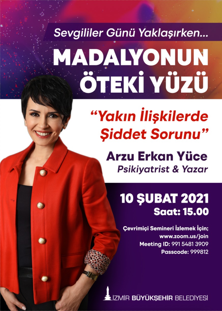 İzmir Büyükşehir Belediyesi, kadına yönelik şiddetle mücadelede farkındalığı arttırmak için çalışmalarını sürdürüyor. Büyükşehir Belediyesi, 10 Şubat saat 15.00’te psikiyatrist yazar Arzu Erkan Yüce’nin katılımıyla “Madalyonun Öteki Yüzü: Yakın İlişkilerde Şiddet Sorunu” konulu çevrimiçi bir seminer düzenliyor. Katılımın 300 kişiyle sınırlı olduğu etkinliğin kaydı, 14 Şubat’ta İzmirTube üzerinden yayınlanacak.