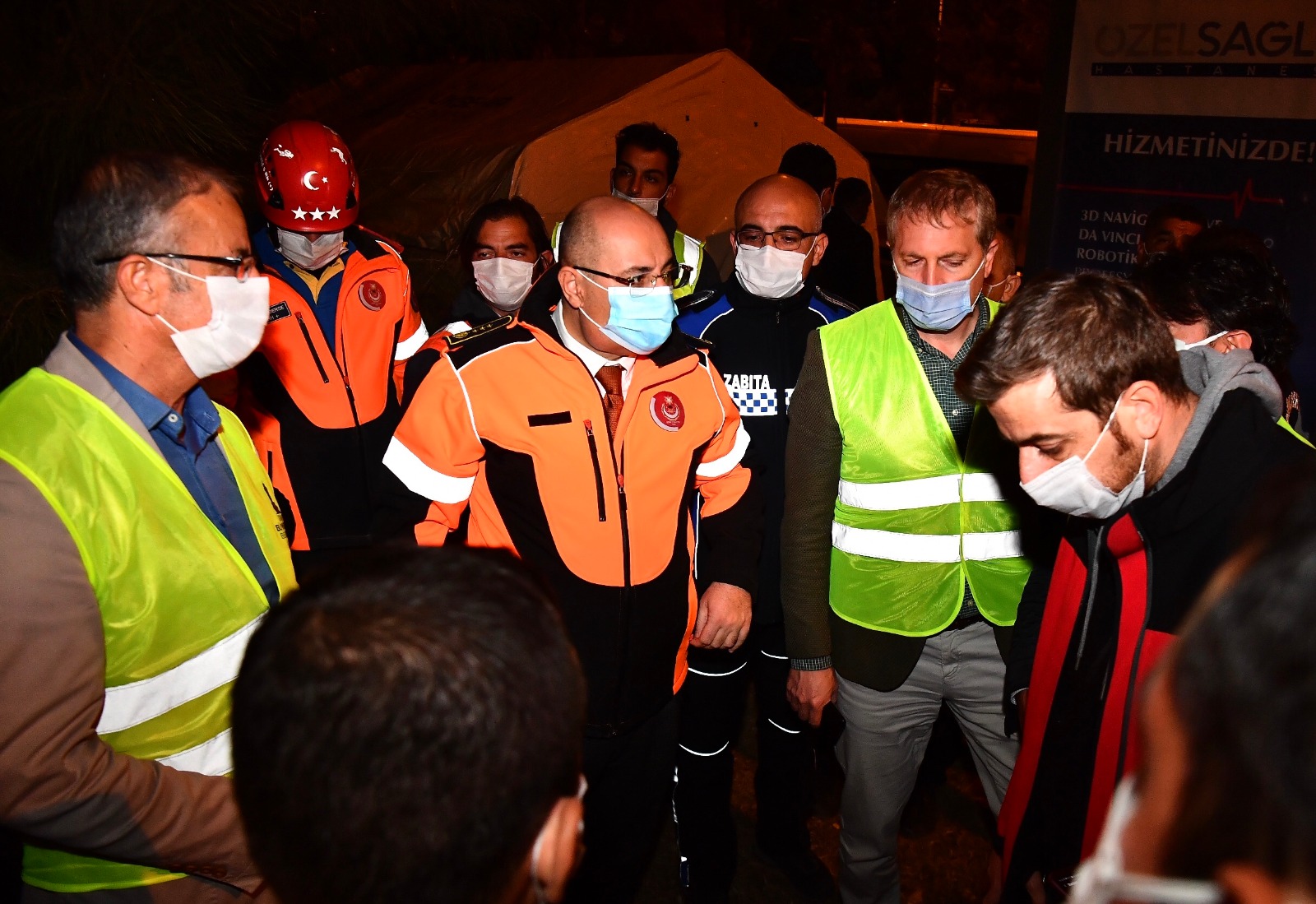 İzmir Büyükşehir Belediyesi Genel Sekreteri Dr. Buğra Gökçe, depremzedelere destek olmak, katkı vermek isteyenlerin İzmir Büyükşehir Belediye Başkanı Tunç Soyer’in ve İzmir Büyükşehir Belediyesi’nin sosyal medya hesaplarındaki duyuruları ya da Bizİzmir dijital platformlarını takip edebileceğini hatırlatarak, "Yaşanan bu afetin sancılarını depremden zarar görmüş yurttaşlarımıza en az yaşatabilmek, onları rahat ettirmek için elimizden geleni yapıyoruz. Yurttaşlarımızın içleri müsterih olsun. İzmir Büyükşehir Belediyesi güçlü ve büyük bir kurum. Her zaman depremzedelerimizin arkasında olacağız. Bize güvenmelerini istiyoruz. Devletimizin tüm organlarının desteklerini alıyoruz. Türkiye'nin her yerinden belediyelerimiz yardımımıza koştu. Onlara da çok teşekkür ediyor ve bizimle koordineli bir şekilde çalışmalarını rica ediyoruz" şeklinde konuştu.