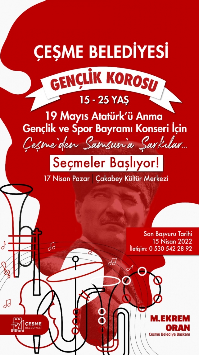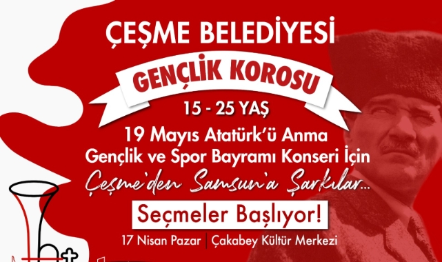 Kültür ve sanat çalışmalarına hız kesmeden devam eden Çeşme Belediyesi Kültür ve Sosyal İşler Müdürlüğü bünyesinde Gençlik Korosu kuruluyor. 15-25 yaş arası gençlerden oluşan Koro’nun son başvuru tarihi 15 Nisan 2022. “Çeşme’den Samsun’a Şarkılar” konseriyle başlayacaklarÇeşme’li gençlerin müziksel gelişiminin sosyal yaşamlarında olumlu etkisi olacak eğitimlere önem verdiğini ifade eden Çeşme Belediye Başkanı M. Ekrem Oran, “Çeşme Belediyesi Gençlik Korosu sanatsal ve kültürel bir buluşma olacak, gençlerimiz hem dünya ülkeleri hem de Türkiye koro müziği yapısını öğrenecekler, hayata bakış biçimlerinde fark yaratacaklar. Ulusal değerlerimizi de belleklerinde taze tutacaklar ve ilk konserleri 19 Mayıs Atatürk’ü Anma Gençlik ve Spor Bayramı’nda “Çeşme’den Samsun’a Şarkılar” konseri ile tüm sanatseverler ile buluşacaklar” dedi. “En güzel enstrüman insan sesidir”“En güzel enstrüman İnsan Sesidir ve Koro “İnsan” demektir” diyen Orkestra ve Koro Şefi Uğur Sayınbatur şunları söyledi: “Çeşmeli gençlerimizle birlikte nefes alıp hikayemizi oluşturacağımız, kültürel kazanımlar elde edeceğimiz Çeşme Belediyesi Gençlik Korosu korist seçmelerinde, adayların müzikal işitmelerine, ses renklerine, müziğe yatkınlıklarına, melodi ve ritim hafızalarının göz önünde bulundurulacağı bir performans sınavı yapılacak.”