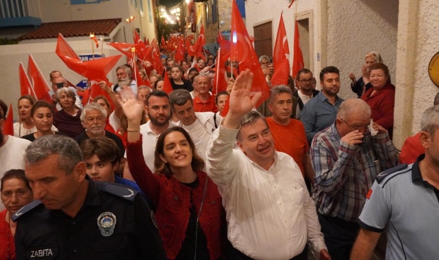 Çeşme Belediyesi tarafından Cumhuriyet’in 100’üncü yıl kutlamaları kapsamında düzenlenen yürüyüş Musalla Mahallesi 16 Eylül Parkı’ndan başladı. Binlerce vatandaş, ellerinde bayraklar ve meşalelerle Cumhuriyet Meydanı’na yürüdü. Çeşme Belediye Başkanı M. Ekrem Oran korteje eşi Nuriş Oran ve oğlu Nazım Çetin Oran ile birlikte katıldı. Meclis üyeleri ve muhtarlar da kortejde yer aldı. Yürüyüş boyunca bando eşliğinde marşlar çalındı. Çeşmeliler balkonlarından bayraklar sallayarak coşkuya ortak oldu.