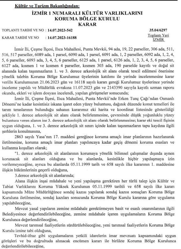 Çeşme Ilıca Mahallesi Punta Mevkisi ile Alaçatı Büyükköl bölgesi, tarihi kalıntılara rastlanması sebebiyle Kültür ve Turizm Bakanlığı tarafınan 1. derece arkeolojik sit alanı ilan edildi.