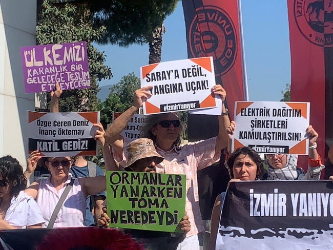 22 Temmuz 2024 yılında her gün yüzlerce İzmirlinin kullandığı Alsancak’ta Özge Ceren Deniz ve İnanç Öktemay defalarca elektrik kaçağı olduğu için bildirimde bulunulan ve hiçbir önlem alınmayan yerde elektrik akımına kapılarak hayatını kaybetti. Ceren’in, İnanç’ın katili Gediz Elekrik; yanan ormanların, evlerin, hayvanların sorumlusu da bizlerden aldığı binlerce lirayı cebine indirip soyguncu faturalarla cebimizdeki üç kuruşa göz dikip hiçbir önlem almayan Gediz Elektriktir. Talan ettikleri doğayı ranta açan Saray’a 13 uçak alıp yangın döneminde yangın söndürme uçaklarını satan saray rejimi de bu yangınların sorumlusudur. Ülkemizde her afet bir felakete dönüşüyor. Kapitalizme açtıkları kentler de ya binaların altında kalarak can veriyoruz ya sel baskınlarıyla ya da yangın ile. Saray’a ait bir uçak ile 7, Diyanet İşleri Başkanlığı’nın bir yıllık bütçesi ile 273 yangın söndürme uçağı alınabiliyor. Saray’a ait 13 uçak varken ülkenin dört bir yanı yanarken yangın söndürme uçaklarımız satılıyor. Tüm kamusal haklarımıza saldıranlar özelleştirme ile kenti yağmaya ve talana açıyor. Özelleştirilen elektrik dağıtım şirketleri yangına sebep olurken tek bir sorumlu ceza almıyor. Bütün kent yangın bölgeleri için seferber olurken iktidar sorumluluğunu yerine getirmiyor, yerel yönetimler geçmişten ders alıp önlem almıyor. Bizler bu kentin kadınları, işçileri, öğrencileri, emeklileri; yaşamı yeniden var edenleri olarak yaktığınız börtü böceğin, ağacın, hayvanın, katlettiğiniz insanların hesabını sizden soracağız. Elektrik dağıtım şirketleri acil kamulaştırılsın, yanan bölgeler imara açılmadan yeniden ağaçlandırılsın, sorumlular yargılansın!