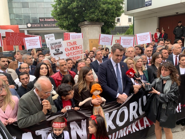 “CHP ÖRGÜTÜNE ÇAĞRIMDIR”CHP örgütüne çağrımdır: Bize açtıkları hatlarda mücadele etmekten vazgeçelim. 'Hattı müdafaa yoktur, sathı müdafaa vardır; o satıh bütün İzmir’dir!' Öyle yürüyelim ki o yolları, korksunlar bizden! Her yer İzmir, Cumhuriyet ve adalet olsun!Biz söz veriyoruz: Biz bu ülkeyi her türlü yanlıştan, kötülükten, adaletsizlikten ve zulümden kurtaracağız!"Yapılan açıklamalarından ardından İl Başkanlığı öncülüğünde bir araya gelen partililer, Konak’ta bulunan İl Milli Eğitim Binası’na yaşanan Kahramanmaraş ve Şanlıurfa saldırılarını protesto etmek için sessiz yürüyüş düzenledi.İl Milli Eğitim Müdürlüğü önünde de açıklamlarda bulunan CHP İzmir İl Başkanı Çağatay Güç, Milli Eğitim Bakanı Yusuf Tekin'e istifa çağrısında bulundu.Ardından 81 ilde CHP’nin eş zamanlı olarak Milli Eğitim önünde gerçekleştirdiği basın açıklamasını İl Eğitim Sekreteri Gülden Aslı Değirmenci okudu.Bildiride şu ifadelere yer verildi:23 Nisan 1920, egemenliğimizin kayıtsız şartsız millete ait olduğunun ilan edildiği gündür! Milli