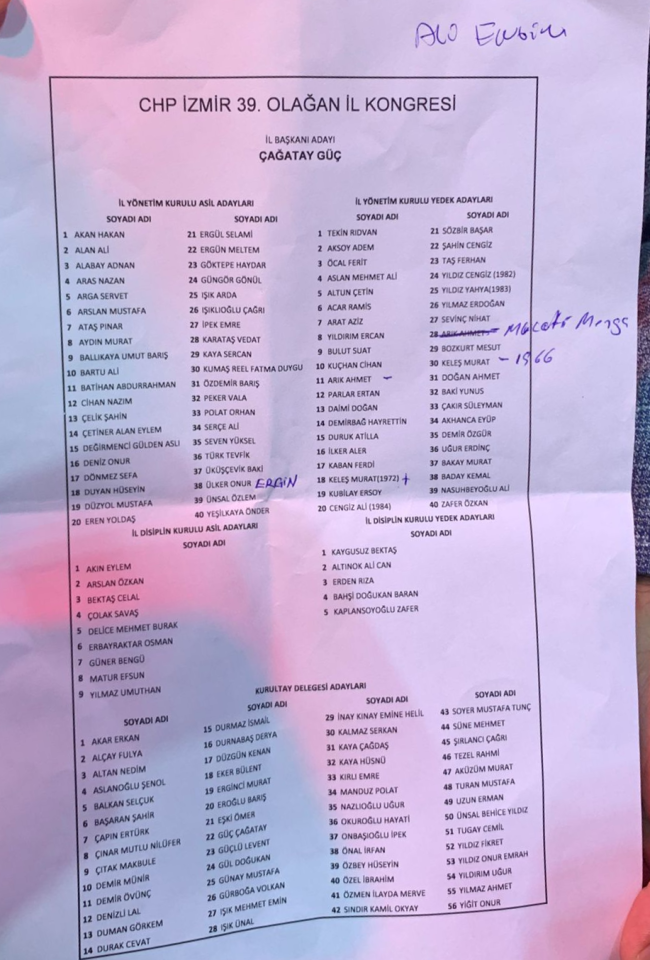ÖMER FARUK ALTIN/EGE'YE BAKIŞ - CHP İzmir’de 39'uncu Olağan İl Kongresi devam ediyor.Kongrede, son yerel seçimlerde Aliağa Belediye Başkan Adayı ve İzmir Büyükşehir Belediyesi Genel Sekreter Yardımcısı Çağatay Güç, Genel Başkan Özgür Özel’in çağrısıyla tek aday olarak seçime girecek.Partinin kongre ve kurultaylarında gelenek haline gelmiş olan ‘çarşaf liste’ ise bu kez kongrede uygulanmadı ve oy çokluğuyla ‘blok liste’ olması kararlaştırıldı.Protokol konuşmaları sonrasında aday olacaklara listelerini teslim etmeleri için divan başkanlığı tarafından süre verildi. Sürenin sonunda Genel Merkezin de desteğini alan Çağatay Güç’ün il başkanlığı kesinleşti. KURULTAY DELEGELERİ BELLİ OLDU!Partinin yapılacak 39. Olağan Kurultayı için oy kullanabilecek kurultay delegelerinin olduğu liste açıklandı.