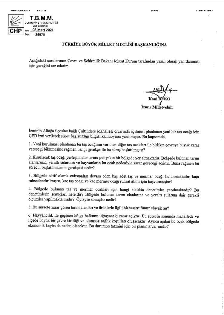 CHP İzmir Milletvekili Kani Beko, İzmir'in aliağa ilçesine bağlı Çaltılıdere Mahallesi civarında açılması planlanan yeni bir taş ocağı için ÇED izni verilerek sürecin başlatılmasına tepki göstererek konuyu Meclis gündemine taşıdı. Taş ocağının yerleşim yerlerine çok yakın olmasının büyük bir ekolojik denge sıkıntısı yaratacağı, insan ve diğer canlı yaşamını olumsuz etkileyeceği konularını irdeleyen Beko, bu çerçevede aşağıdaki sorulara cevap istedi;