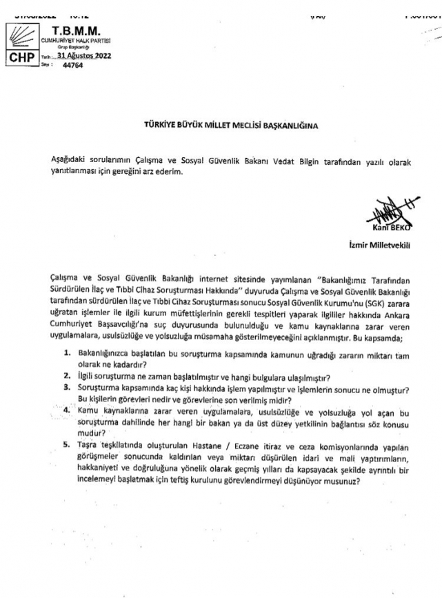 İlgili soruşturmanın ne zaman başlatıldığı ve hangi bulgulara ulaşıldığını da soru önergesine taşıyan İzmir Milletvekili Kani Beko, şu sorularına cevap bekliyor: Soruşturma kapsamında kaç kişi hakkında işlem yapılmıştır ve işlemlerin sonucu ne olmuştur? Bu kişilerin görevleri nedir ve görevlerine son verilmiş midir? Kamu kaynaklarına zarar veren uygulamalara, usulsüzlüğe ve yolsuzluğa yol açan bu soruşturma dahilinde her hangi bir bakan ya da üst düzey yetkilinin bağlantısı söz konusu mudur? Taşra teşkilatında oluşturulan Hastane / Eczane itiraz ve ceza komisyonlarında yapılan görüşmeler sonucunda kaldırılan veya miktarı düşürülen idari ve mali yaptırımların, hakkaniyeti ve doğruluğuna yönelik olarak geçmiş yılları da kapsayacak şekilde ayrıntılı bir incelemeyi başlatmak için teftiş kurulunu görevlendirmeyi düşünüyor musunuz?
