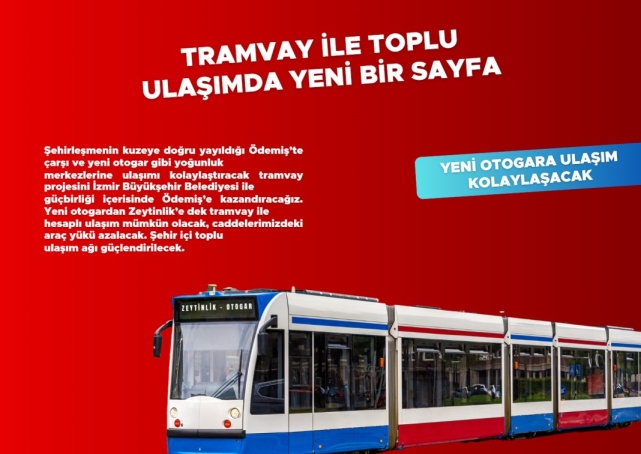 Şehirleşmenin kuzeye doğru yayıldığı Ödemiş’te çarşı ve otogar gibi yoğunluk merkezlerine ulaşımı kolaylaştıracak tramvay projesini İzmir Büyükşehir Belediyesi ile güçbirliği içerisinde Ödemiş’e kazandıracağız. Otogardan Zeytinlik’e dek tramvay ile hesaplı ulaşım mümkün olacak, caddelerimizdeki araç yükü azalacak.