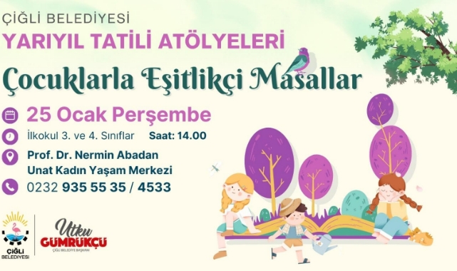 Her yıl düzenlediği etkinliklerle çocuklara öğretici ve eğlenceli bir tatil dönemi yaşatan Çiğli Belediyesi, 2023-2024 eğitim öğretim yılının sömestr tatilinde de karne coşkusu yaşayan çocukları unutmadı. Sömestr programı, 25 Ocak Perşembe günü 3. ve 4. Sınıf öğrencilerine yönelik düzenlenecek “Çocuklarla Eşitlikçi Masallar” etkinliği ile başlayacak. 26 Ocak Cuma günü 7-12 yaş arası çocuklar için Yaratıcı Ritim Atölyesi gerçekleştirilecek. 29 Ocak Pazartesi günü 9-12 yaş arası çocuklar için Yaratıcı Drama Atölyesi düzenlenecek. Program 31 Ocak Çarşamba günü 3. ve 4. Sınıf öğrencileri için düzenlenecek Öykü Okuma-Yazma etkinliği ile sona erecek. Çiğli Belediyesi Prof. Dr. Nermin Abadan Unat Kadın Yaşam Merkezi’nde düzenlenecek etkinliklere katılmak isteyenler 0232 935 55 35 (4533) numaralı hattan bilgi alabilecek.