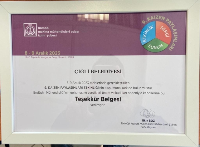 2014 yılından itibaren Makine Mühendisleri Odası İzmir Şubesi tarafından kurumlarda sürekli iyileştirme ve sürdürebilirliğin sağlanması amacıyla düzenlenen Kaizen Paylaşımları’nın dokuzuncusu Tepekule Kongre Merkezi’nde gerçekleştirildi. Çiğli Belediyesi, “TSE EN ISO 9001:2015 Kalite Yönetim Sisteminin QDMS ile Dijital Hale Getirilmesi” projesi ile sergilenmeye değer görülen 180 proje arasında yer alan tek kamu kurumu oldu. Etkinliğe ev sahipliği yapan Makine Mühendisleri Odası İzmir Şubesi, endüstri mühendisliğinin gelişmesine verdiği önem ve katkılardan dolayı Çiğli Belediyesi’ne Teşekkür Belgesi takdim etti.