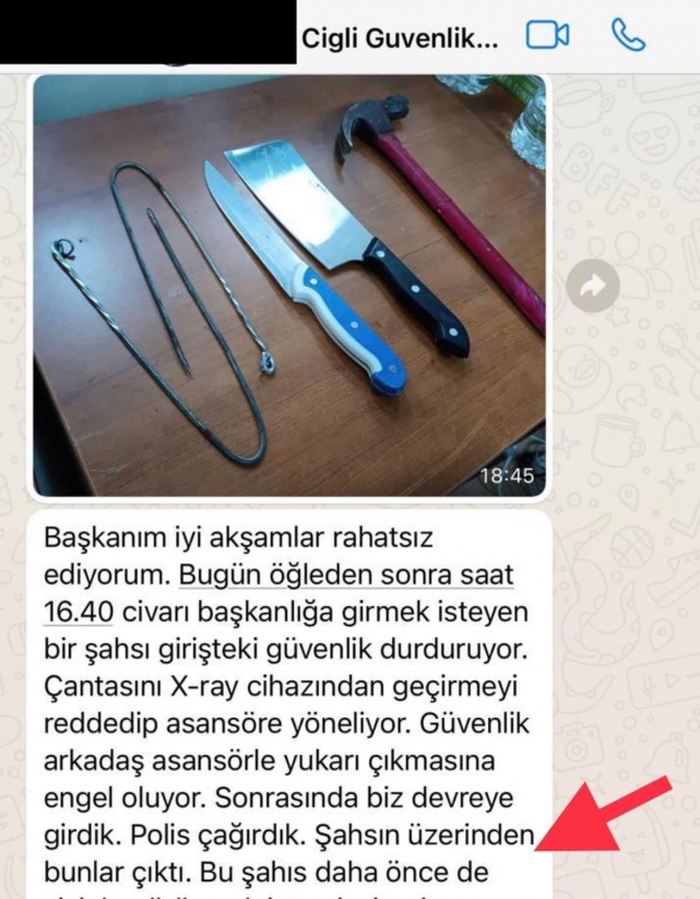 EGE’YE BAKIŞ- Çiğli Belediyesi'nin düzenlediği yılbaşı kutlama programı için X-ray cihazından üst kontrol yapılmasına izin vermeyen şahıs, kaçmaya çalışırken güvenlik ekipleri tarafından yakalandı. Şahısın üzerinde yapılan aramada sırt çantasından çok sayıda bıçak, çekiç, satır ve şiş çıktı. Çiğli Belediye Başkanı Utku Gümrükçü, sosyal medya hesabından yaptığı paylaşımda, belediyeye yılbaşı öncesi saldırı girişimi yapılmak istendiğini duyururken, şahsın etkisiz hale getirildiğini açıkladı.