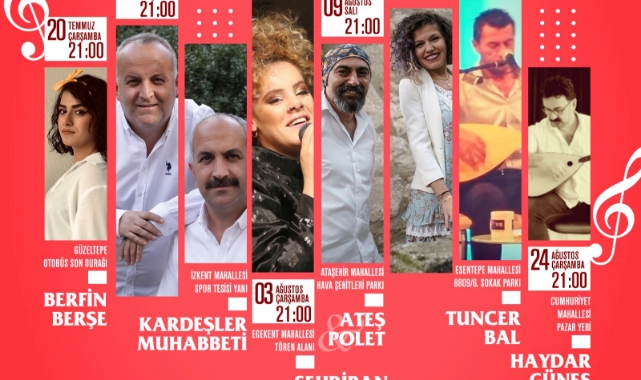 Kültür ve Sosyal İşler Müdürlüğü’nün organize edeceği yaz konserleri kapsamında Berfin Berşe 20 Temmuz’da Güzeltepe Mahallesi’nde, Kardeşler Muhabbeti grubu 28 Temmuz’da İzkent Mahallesi’nde, Şehriban 3 Ağustos’ta Egekent Mahallesi’nde, Ateş Polet 9 Ağustos’ta Ataşehir Mahallesi’nde, Tuncer Bal 17 Ağustos’ta Esentepe Mahallesi’nde, Haydar Güneş Özçelik 24 Ağustos’ta Cumhuriyet Mahallesi’nde Sahne alacak.